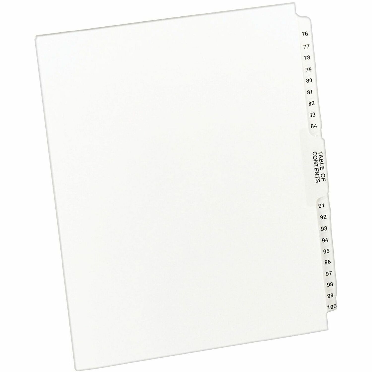 Use letter-size, collated legal dividers to organize index briefs, legal briefs, mortgage documentation files, and more. White paper stock dividers feature clear, RipProof, reinforced side tabs. Tabs are numbered from 76 to 100 on both sides with Avery Style Helvetica Bold typestyle so you can easily access the documents you need. Binding edge is unpunched so indexes can fit any binding system. Design conforms to all state and federal requirements. Index dividers include a Table of Contents tab.